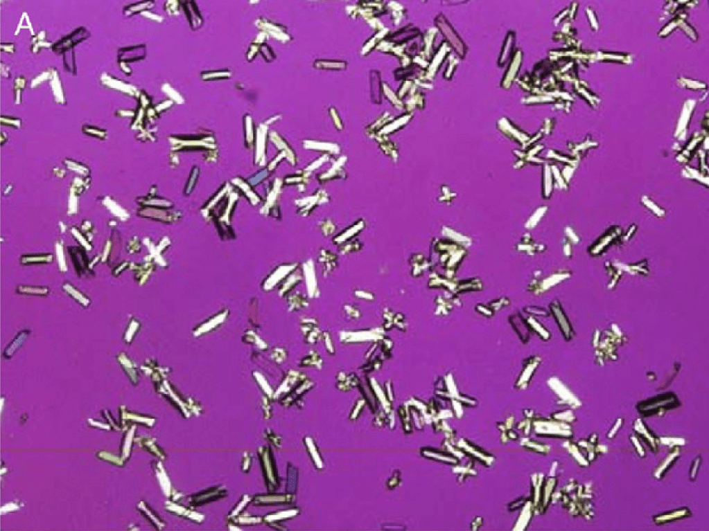 - Crystal formation: In volume depleted patients who have gotten TMP/SMX, crystals can precipitate and form (see Picture of birefringent pleomorphic crystalluria on polarized microscopy from Shrishrimal and Wesson). As an interesting pearl, patients who are hypoalbuminemic or have other drugs on board that might bind albumin (e.g., penicillin) the concentration of free TMP/SMX can be high enough to cause it to precipitate even if the patient isn’t volume depleted.