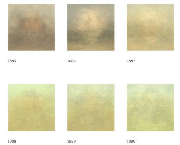 Maybe not. An art blogger named Jason Bailey empirically analyzed the evolution of Van Gogh’s color palette over time and found that, although he definitely used more yellow in his final years, the shift actually occurred in 1888, before he was admitted to the asylum in 1889 (and theoretically might have been exposed to digitalis). Van Gogh’s palette seems to have been brightening and becoming more yellow even in 1887.