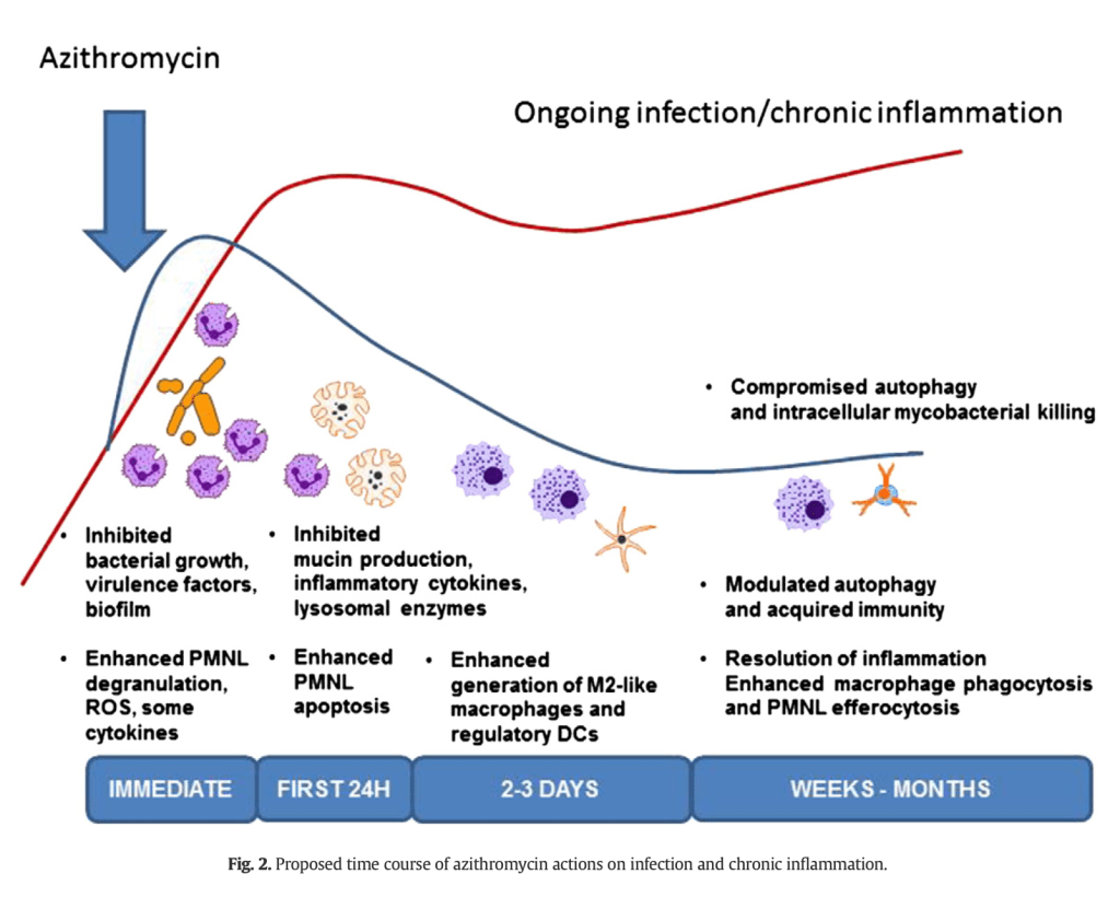 If we go back to the mechanism of action, remember that macrolides accumulate inside cells, including immune cells, at concentrations 90-350x higher than in serum. And they accumulate inside for at least 28 days. In fact, the intensity of anti-inflammatory activity correlates with cellular accumulation. One study found that IL-6 and prostaglandin E2 suppression were highest when the cellular concentration of the macrolide (or other compound) was highest.