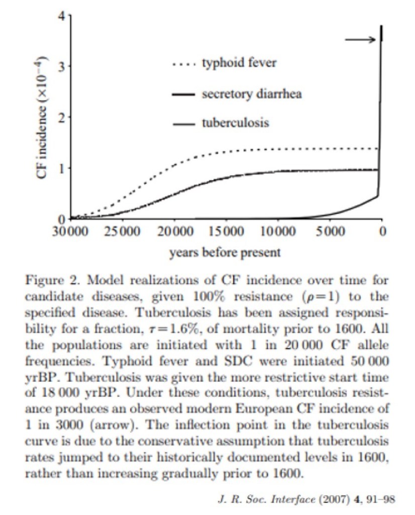 The researchers studied the current prevalence of MTB, typhoid, and cholera and looked backward in time. In the end, they found that only a significant spike in MTB prevalence around the year 1600 would account for current rates of cystic fibrosis carriers in current populations. This matches the timing of the White Plague pandemic discussed above. These findings suggest that the current prevalence of the cystic fibrosis trait is explained by protection if offers against MTB infection.