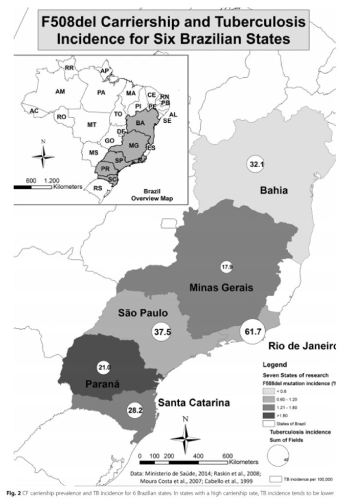 A group of researchers from Brazil examined the rates of cystic fibrosis heterozygosity and compared this with MTB incidence in the same areas. They found that MTB incidence was inversely proportional to the rates of cystic fibrosis trait. This was true even after controlling for factors such as socioeconomic status.