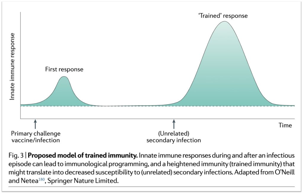And BCG not only activates the immune system against cancer, it does the same other infections. One of the other mechanisms of benefit is something called Trained Immunity. This is the concept that innate immune cells (e.g., macrophages) “trained” by one infection or vaccine will respond with a heightened response to a second, unrelated, infection.