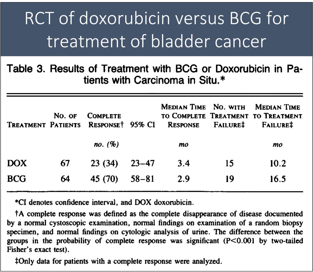 And the promise of BCG therapy in bladder cancer became clear with the results of a small trial published in 1976. The investigators treated 9 patients with recurrent non-muscle invasive bladder cancer with BCG and found a 12-fold reduction in recurrence. In subsequent years, BCG has also been compared head-to-head against chemotherapy – specifically doxorubicin – and proved superior. As noted earlier, meta-analyses have confirmed that it really does work.