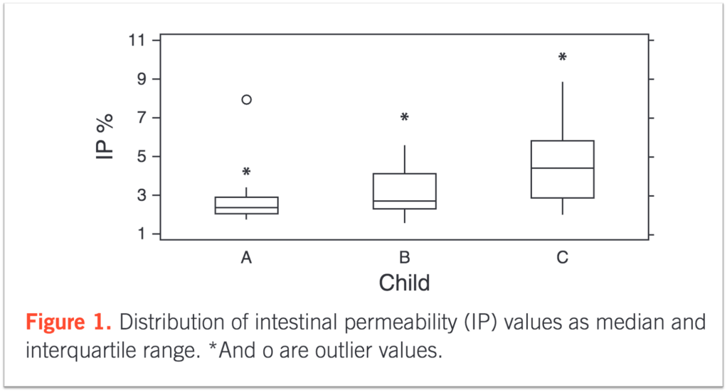 The next factor that cirrhosis promotes is increased intestinal wall permeability. One study found increased permeability in 42% of those with cirrhosis and just 4% of controls. And, just as was seen with bacterial overgrowth, there was a worsening as the Child-Pugh score increased.