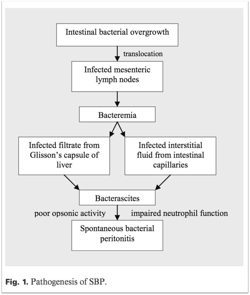 There is probably one other intermediary: the blood. Though most patients with SBP don’t have positive blood cultures, studies demonstrate genetically similar bacterial DNA in the blood and ascites of patients with cirrhosis. Putting it together, the sequence of events leading to SBP may be: Bacterial overgrowth ➔ Translocation to mesenteric lymph nodes ➔ Bacteremia ➔ Ascites.