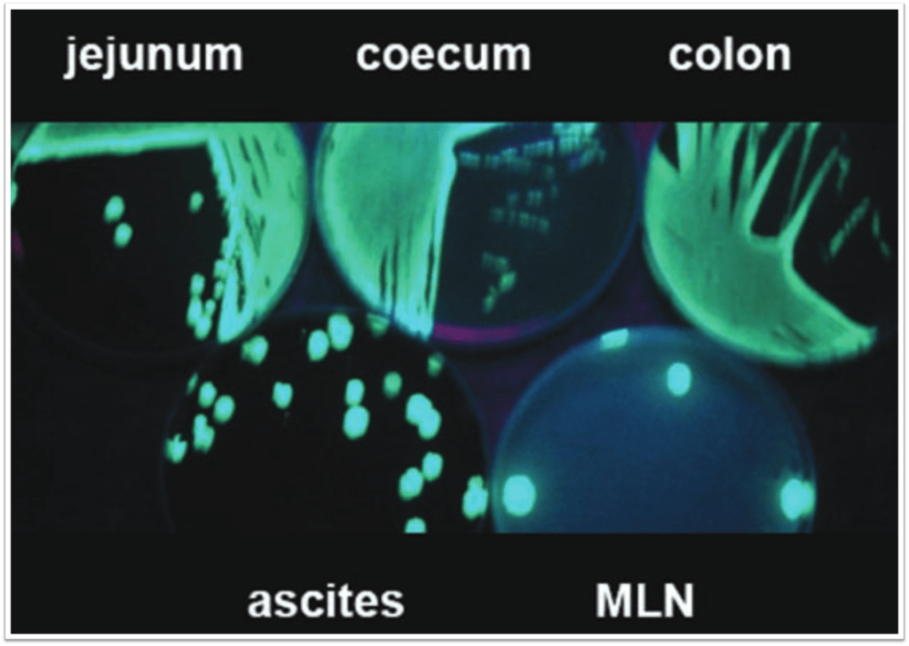 And translocation to the MLN is more common as the severity of cirrhosis worsens. Bacteria that grow in ascites are the same found in MNL and the cecum. And, the frequency of isolation is typically: cecum > MLN > ascites, suggesting that the MLN are intermediaries.