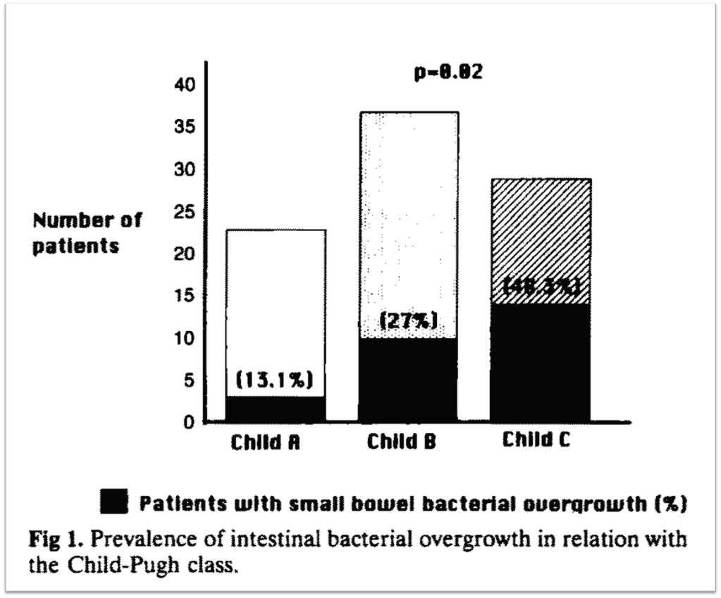 Beginning with intestinal bacterial overgrowth, this has been observed in rat models of cirrhosis and increases in frequency with worsening severity of cirrhosis. In one study, bacterial overgrowth was measured using a breath test after ingestion of glucose. The test was positive in 30% of those with cirrhosis and in none of the controls subjects. And as Child-Pugh score increased, so did the risk of bacterial overgrowth.