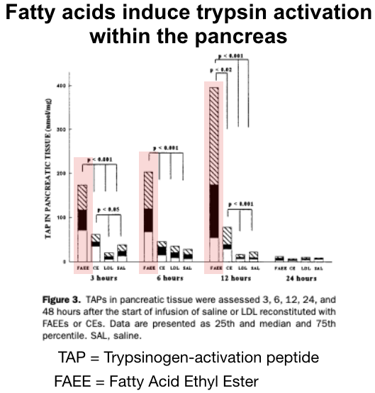 It turns out that free fatty acids actually are able to activate trypsinogen to become trypsin, which was demonstrated in a 1997 study in the journal Gastroenterology. The researchers looked at rat pancreases, and found that infusing fatty acid ethyl esters, which are sort of a form of free fatty acids, into rats led to pancreatitis. And when they looked at the rats pancreases, they found that the fatty acids had activated trypsinogen to trypsin, which then was able to auto-digest the pancreas and set off a cascade that further propagated the initial injury.