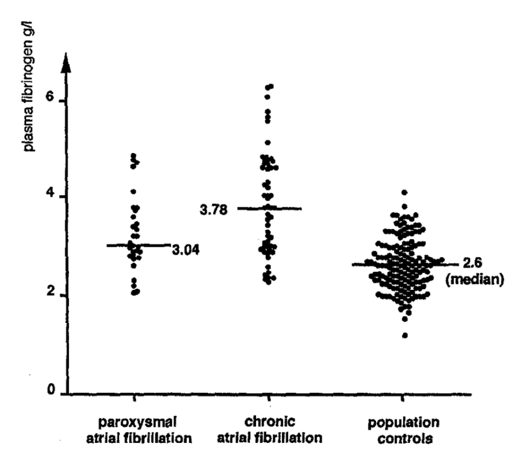 One example is the consistent finding of elevated levels of fibrinogen and d-dimer in those with AF. This has been seen repeatedly. In fact, the spontaneous echo contrast we see on imaging is partly due to RBC aggregation. And, of course, fibrinogen promotes the aggregation of RBCs. Similarly, markers of endothelial injury, including vWF, are elevated in patients with AF.