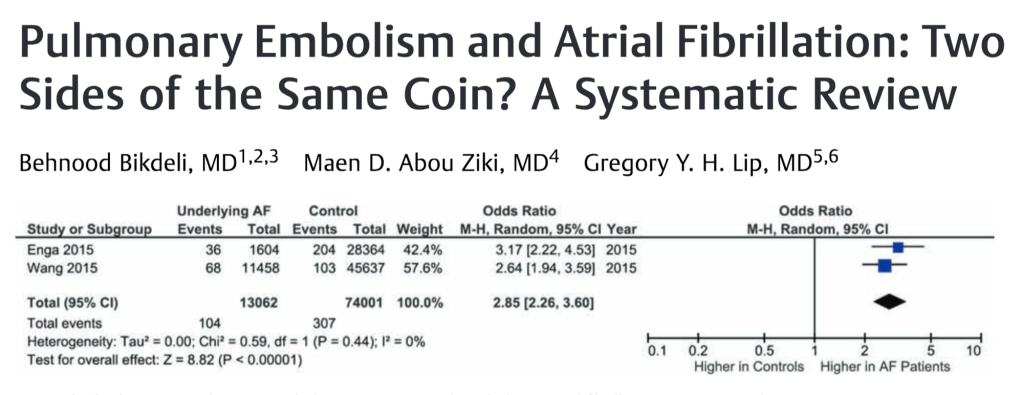 - Multiple studies demonstrate an association between atrial fibrillation and pulmonary embolism. The direction of causality is probably bilateral.