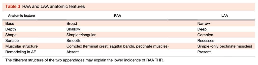 But, even accounting for this, PE is far less common than systemic embolization. Most commonly, stroke. One reason stems from the appearance of the right atrial appendage. Not only does the right atrium have an appendage, just as with the LA appendage, it is the most common site of thrombus formation. But it is also quite different in appearance compared to the left atrial appendage. It is broader and more shallow and lacks recesses. This, along with some other differences, likely contribute to the lower rates of RA thrombus.
