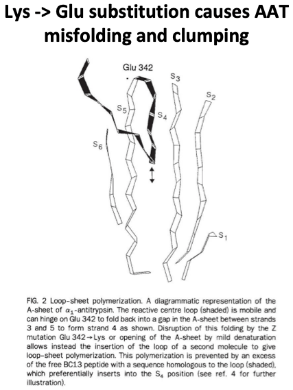 The accumulated protein gets “stuck” in the liver and cannot traverse to the lung to prevent neutrophil elastase activity in the lung, leading ultimately to lung tissue breakdown and emphysema.