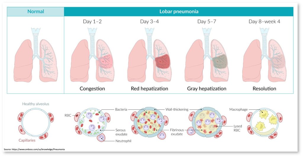 This is typically what you see over the first four days of a pneumonia. The fact that we see this inflammatory infiltrate helps explain why corticosteroids might help in severe cases. It’s often the over-exuberant inflammatory response that leads to severe illness. Steroids help to dampen this a touch.