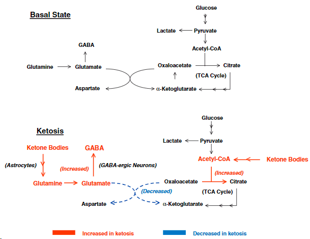 There are three main mechanisms proposed to explain the effect of the ketogenic diet in the prevention of seizures. The first is the GABA shunt. GABA (gamma-aminobutyric acid) is the main inhibitory neurotransmitter in the central nervous system. Ketones are converted in the brain to both glutamine and acetyl-CoA with glutamine further converted to glutamate and then GABA. The high level of brain ketones leads to an increase in seizure-suppressing GABA. What’s more, acetyl-CoA helps drive the glutamate-to-GABA conversion reaction forward even more strongly, and in effect shunts ketones into becoming GABA. This is why this mechanism is named the GABA shunt.