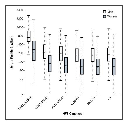 The two main gene variants of HFE that cause HH are H63D and C282Y. In one study of 100,000 patients in Canada with iron overload, patients who were homozygous for C282Y had the worst iron overload, and that genotype was most prevalent in white patients. Although HFE mutations are the most common source of HH, other genes can be involved, such as HJV, which is more prevalent in South Asia and causes juvenile HH. Nor is HH the only inherited cause of iron overload – ferroportin disease, which is most common in Africa, causes excess iron storage just in the liver, leading to the unusual clinical scenario of iron-overload with anemia.