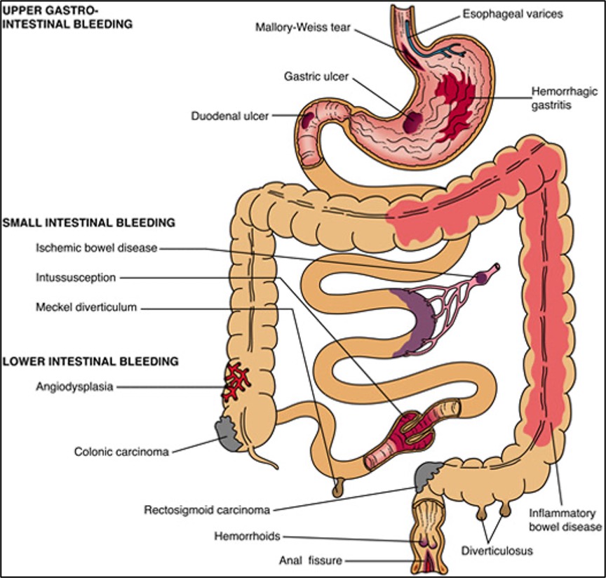 To best answer this question, let’s first review the standard management of a suspected GI bleed. Two important questions to ask yourself are (1) where is this patient bleeding from and (2) how badly are they bleeding? The former is based mostly on symptoms. Technically speaking, an UGIB is bleeding above the ligament of Treitz (located at the junction of the duodenum and jejunum) and patients with melena (black, tarry stools) have a positive likelihood ratio of between 5 and 6 for an UGIB. Blood clots in the stool, on the other hand, are far more likely to be a lower source. However, locating GI bleeds can be tricky because the entire GI tract can bleed and the symptoms are not always precise to one location. For example, a brisk bleed in the stomach can cause bright-red rectal bleeding, while right colon bleeding can cause melena.