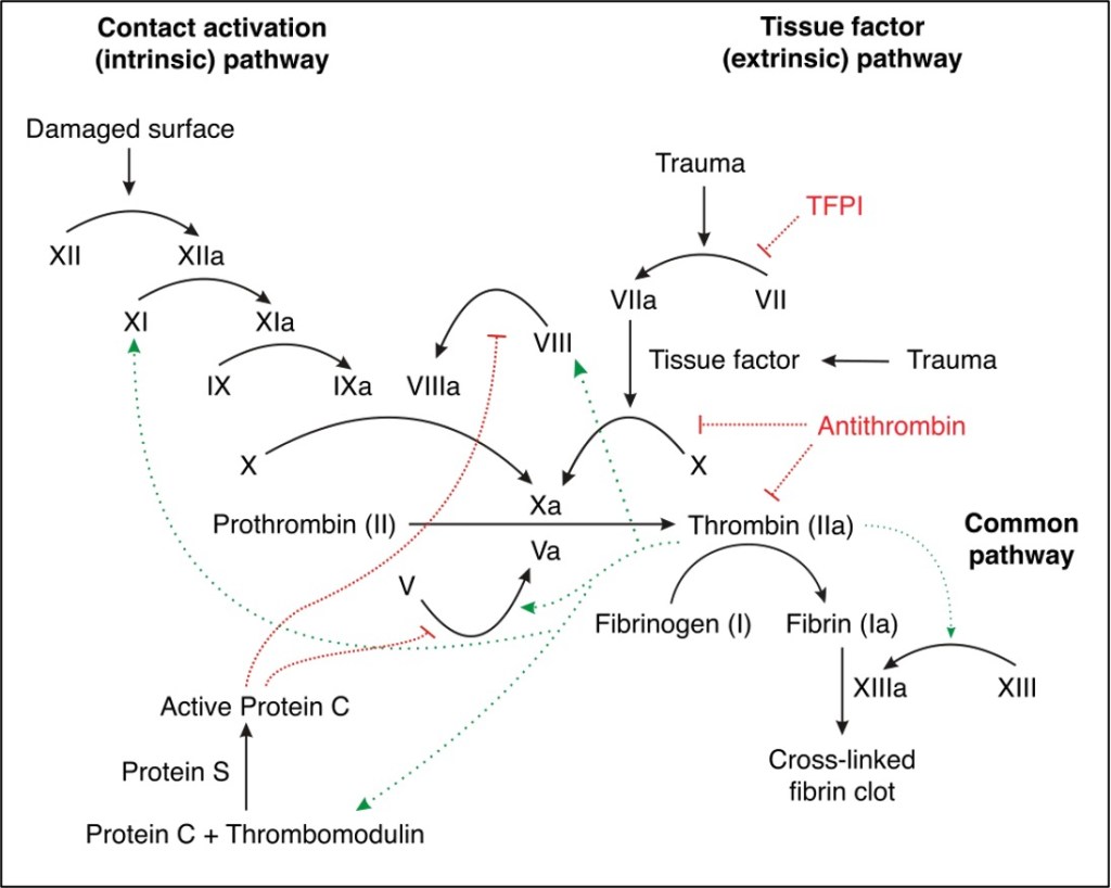 Acid does not affect platelets and coagulation factors in just one way. Coagulation is a complex process that starts when platelets adhere to one another, forming a temporary platelet plug. The coagulation cascade, which is activated both by platelets and by tissue damage, is a series of subsequent reactions where the product of one is the catalyst for the following, which ultimately ends in the conversion of fibrinogen to fibrin and the formation of a sturdy fibrin clot. Like most catalysts, coagulation cascade factors are sensitive to external factors like temperature and pH. For example, when pH is reduced from 7.4 to 7.0, the rate at which the FXa/FVa complex activates prothrombin is reduced by around 70%.