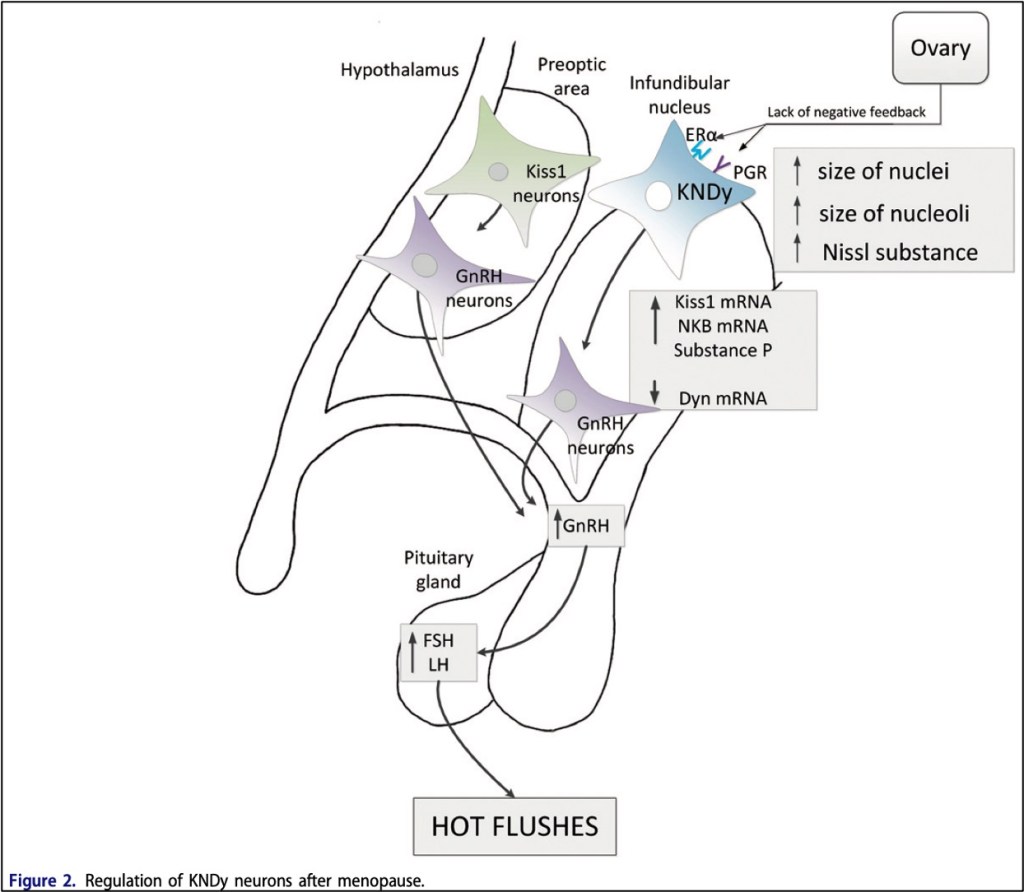 Why do hot flashes happen as the HPG axis changes? Surges in LH are associated with hot flashes, but LH itself may not be the only cause. This is supported by the observation that in women who have had their pituitary glands removed and are receiving estrogen supplementation, withdrawal of estrogen still leads to hot flashes, despite them not producing any LH. One hypothesis is that the hypertrophied KDNy neurons begin to affect the adjacent thermoregulatory centers in hypothalamus. In one study where neurokinin B (the “gas pedal” compound) was injected into subjects who were all in the same phase in the menstrual cycle, they had more hot flashes than those who got no NKB. Hot flashes are also associated with variants in the neurokinin B receptor gene.