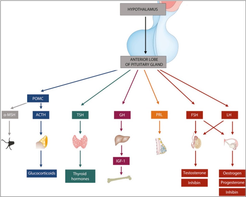 Hot flashes are grouped under the umbrella term “vasomotor symptoms,” which are caused by vasoconstriction or dilation. Hot flashes are the latter. As the blood vessels dilate, heat travels to the skin surface, creating a sensation of warmth. Unlike fever, though, core body temperature actually drops. That part of the mechanism is simple enough, but what actually causes the blood vessels to dilate is a little more complex. It all starts with the hypothalamus and pituitary. Generally, the way the endocrine system works is that the hypothalamus produces a “releasing” hormone, which stimulates the hypothalamus to produce a “stimulating” hormone, which in turn activates the target gland to produce the actual hormone. For example, in the hypothalamic-pituitary-gonadal (HPG) axis, gonadotropin-releasing hormone (GnRH) causes the release of follicle-stimulating hormone (FSH) and luteinizing hormone (LH), which act on the ovaries and testes to result in the release of estrogen, progesterone, and testosterone.