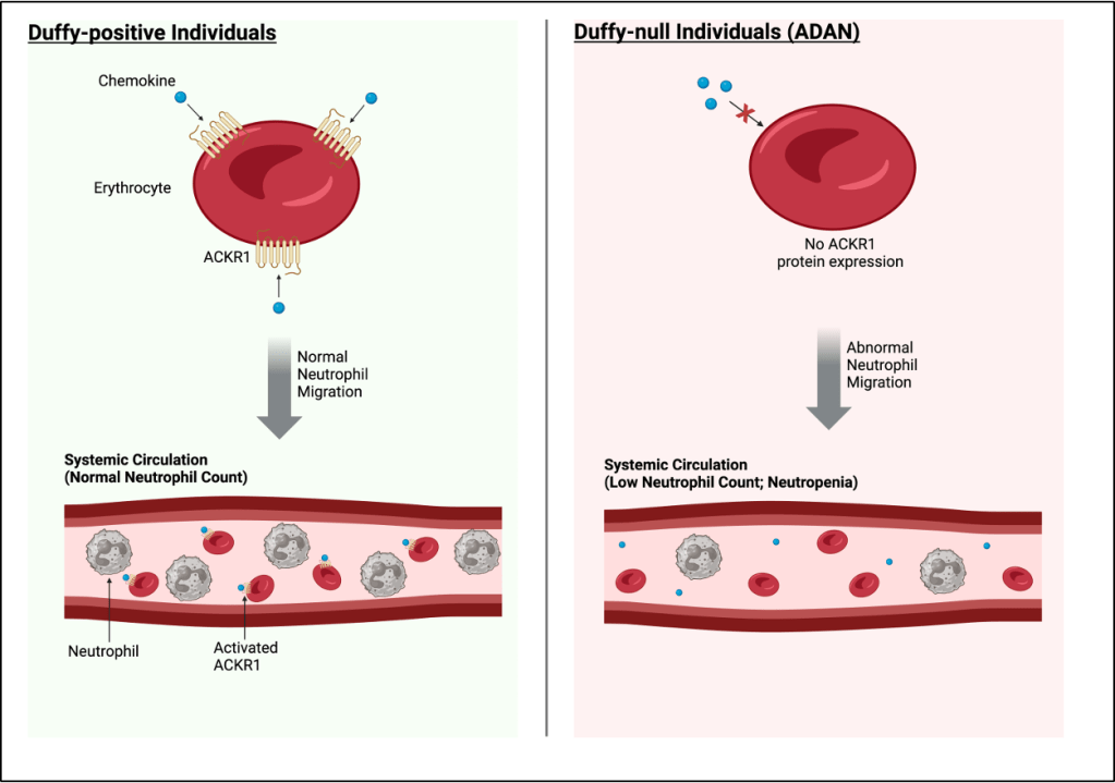 You may have noticed we have been referring to it as Duffy Null Associated Neutrophil Count instead of Duffy Null Associated Neutropenia, even though their neutrophil count isn’t too far off from the typical cutoff for neutropenia (<1,500/μL). This is because these individuals actually have normal total body stores of neutrophils, just not as many circulating in the bloodstream to be counted on a complete blood count (CBC). In some ways, this resembles the response typically seen after steroid administration, where there is an increase in the number of circulating white blood cells (WBC) in the bloodstream due to the demargination of neutrophils, thus raising the WBC count on a CBC, despite the total body neutrophil count remaining unchanged. The opposite happens in DANC. Although the mechanism isn’t entirely clear, a 1979 study using bone marrow aspirates from four DANC patients demonstrated normal cellularity and myeloid maturation, indicating that reduced circulating neutrophils are likely due to altered neutrophil release rather than decreased granulocyte production.