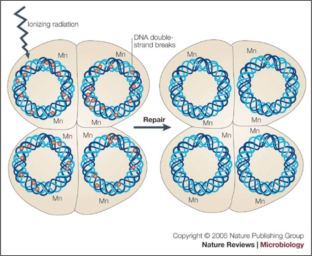 So, how does D. radiodurans survive these conditions? To answer this, we will draw from a 2005 review in Nature, titled “Deinococcus radiodurans – The Consummate Survivor,” by Michael Cox and John Battista. In a very general sense, this bacterium’s superpower involves resistance to DNA damage. Radiation damages DNA by causing a double-stranded break where that double helix strand of DNA fully ruptures. Like other bacteria, D. radiodurans employs double-stranded DNA repair mechanisms, where a homologous region on another intact segment of DNA serves as a template for repair. However, D. radiodurans also possesses different forms of certain DNA repair enzymes, which enable more efficient and accurate repair compared to other bacteria.