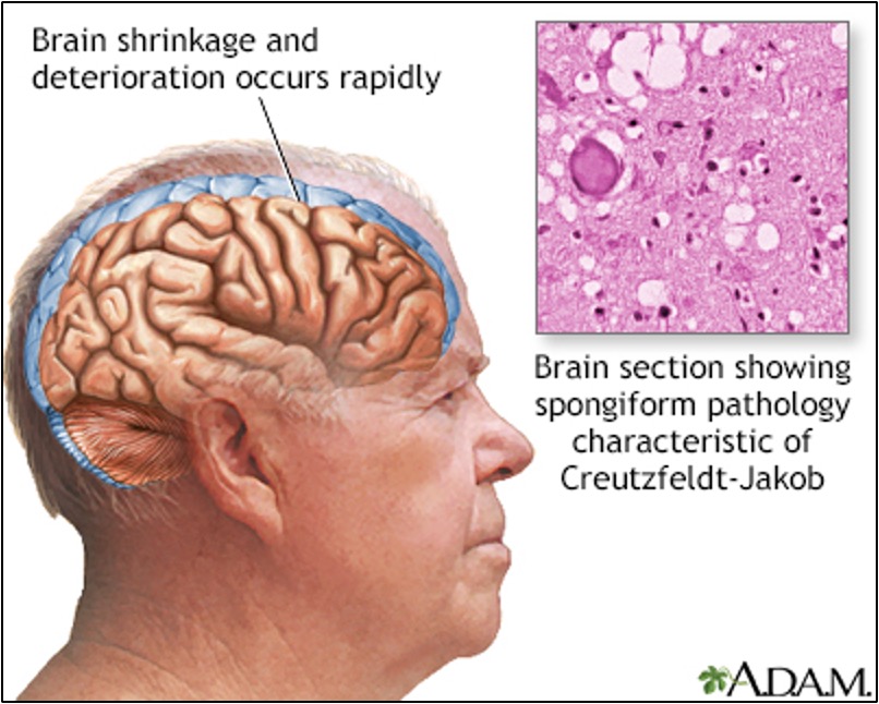With neurons, this cascade leads to neurotoxicity and neurodegenerative symptoms. Acquired prion diseases can be caught by eating infected nervous tissue, such as beef from affected animals, which can cause mad cow disease, also called variant Creutzfeldt-Jakob disease. Exposure to brain matter or cerebrospinal fluid of an affected person, whether from contaminated surgical instruments or from body fluid exposure after a lumbar puncture, can also cause it. These occurrences are exceedingly rare due to safety regulations in the food supply and healthcare facilities.