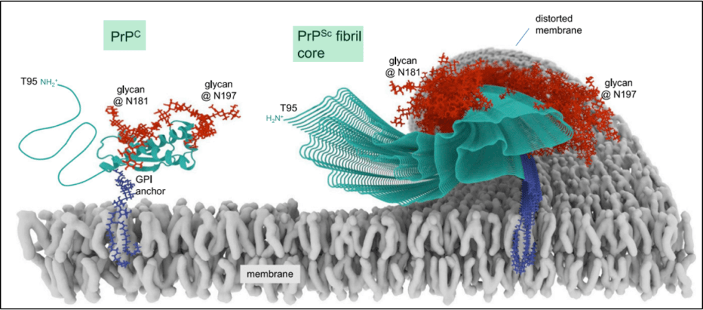 FFI is also a prion disease, similar to CJD. Inherited mutations in the prion gene PRNP cause FFI. There are sporadic cases too, where a PRNP mutation arises de novo. It’s separate from CJD, scrapie, or mad cow disease – the so-called transmissible spongiform encephalopathies. There actually is a physiologic version of prion proteins known as PrP. PrP is a type of protein that we all have that’s bound to cell membranes and transports copper, and it is necessary for the function of neurons in particular.