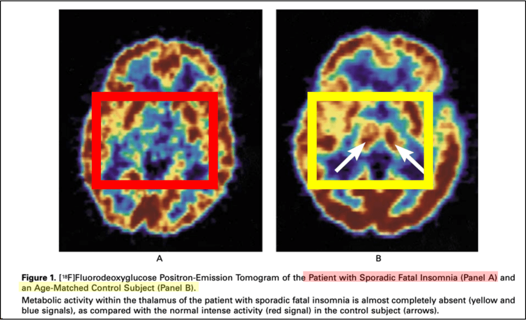 So, why are people with FFI unable to sleep? This actually has to do with the location of where these abnormal prion proteins are forming. As noted earlier, in the 1986 case report, the authors found thalamic degeneration at autopsy. This anatomic pattern has been confirmed with subsequent case series as well, with the consistent finding that familial fatal insomnia is ultimately a thalamic disorder. Below is a PET scan example from the brain of someone with FFI. There is no metabolism in the thalamus; that part of the brain shuts down.